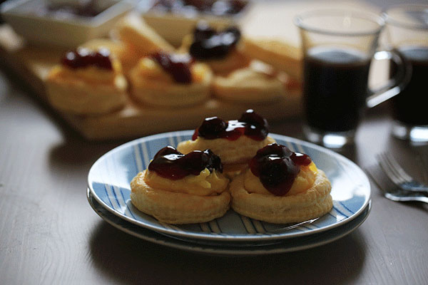 5. بعد أن تبرد دوائر البف باستيري،، إحشي كلاً منها بمقدار ملعقة صغيرة من خليط الكاسترد، فملعقة من التوت.
