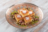 - ادهني صينيَّة الفرن بالزيت، واسكبي خليط السميد برفق، ومُديه بالملعقة.