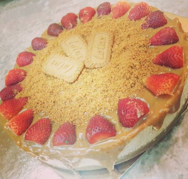 4. الطبقة الثالثة: نذوب زبدة اللوتس في حمام مائي (استخدمي في الخطوة هذه اللوتس الكرانش (الحبيبات) وفي الخطوات السابقة زبدة اللوتس العادية من دون حبيبات، ثم نضع طبقة منها على وجه التشيز ونزينها حسب الرغبة.