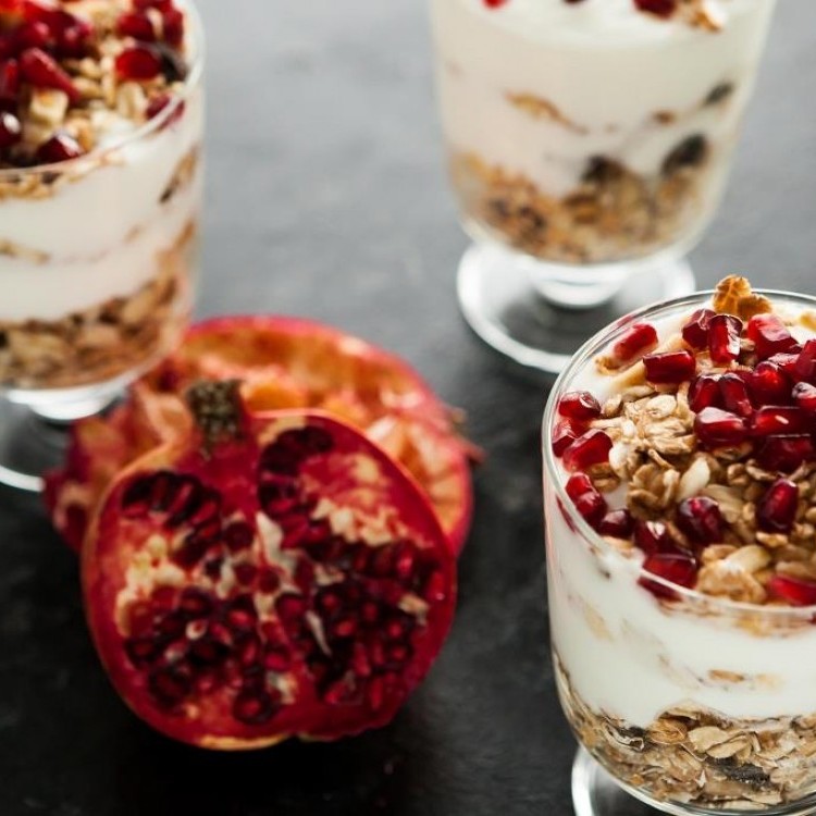 سيحصل أطفالك على قيمة غذائية مضاعفة، بعد إضافة الجرانولا، واللبن الزبادي إلى الرمان.