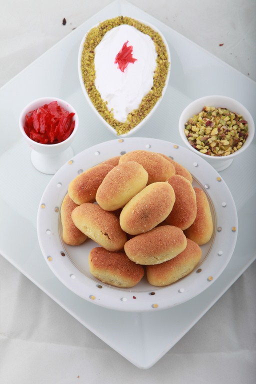 1. لاعداد العجينة: يوضع السميد في وعاء، ويضاف اليه الحليب و50غرام من السكر والخميرة، ويخلط هذا المزيج جيّداً.يضاف اليه 170غرام من ماء الورد والسمن، ويمزج جيداً للحصول على عجينة متماسكة.