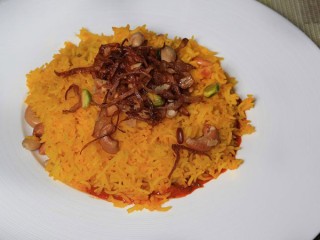 9. قدمي البرياني ساخناً مزيناً بالبصل المقلي واللوز.
