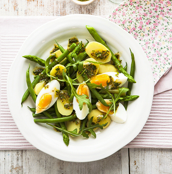 1. أضيفي حبات البطاطس، إلى قدر محتوية على الماء، على النار، واتركيها حتى يغلي الماء. ثم، خففي الحرارة، واتركي البطاطس على النار لمدة 12 دقيقة إضافيّة، أو حتى تصبح طريّةً. بعدها، أضيفي البازلاء، واطهيها لمدة 3 دقائق. ثم، ضعي الهليون، واطهيه لدقيقتين، أو حى يمسي طريّاً. صفّي الخضراوات من الماء، ثم اغسليها بماء جار بارد. بعدها، قطعي حبات البطاطس إلى أنصاف.