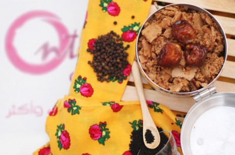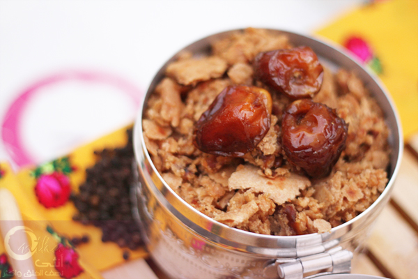 4. يقطع الخبز ويضاف للتمر ويهرس ويحرك حتى يتجانس ثم توضع في صحن التضيف