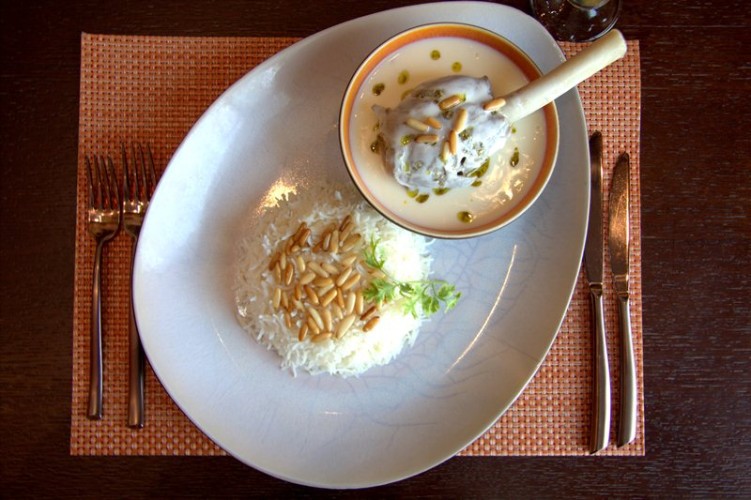 3 ـ لتحضير الأرز: يُغسّل الأرز ويُصفّى جيّداً من الماء، ثمّ يُقلى مع الزبدة على نار هادئة. بعدها، يُسكب مرق اللحم ويُترك المزيج حتّى يغلي. وحينها، تُغطّى القدر، ويُطهى المزيج على نارهادئة مع الملح، لمدّة 15 دقيقة.