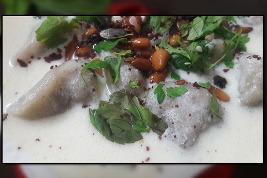 13. عندما تتساوى درجة حرارة المرق واللبن، اسكبي المرق فوق اللبن مع التحريك، حتى يغلي اللبن، ضعي عرف نعناع، ثم ضعي حبات الشيشبرك باللبن واتركي اللبن يغلي قليلا ثم اسكبيه وقدميه.