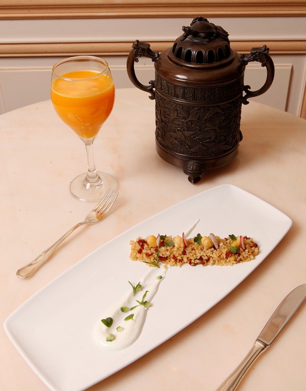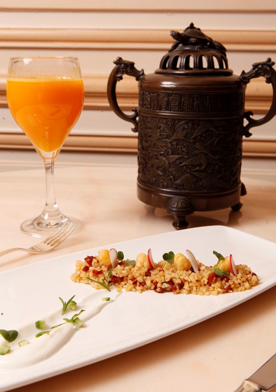4. للتقديم: في طبق التقديم، يسكب البرغل الممزوج مع الملح والبهار الأبيض والبهار الأسود، ويوضع فوقه الحمّص المسلوق. يزّين باللبن الزبادي والخيار المفروم وقطع الطماطم المجفّفة، ويقدّم بارداً.