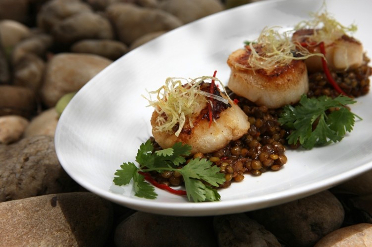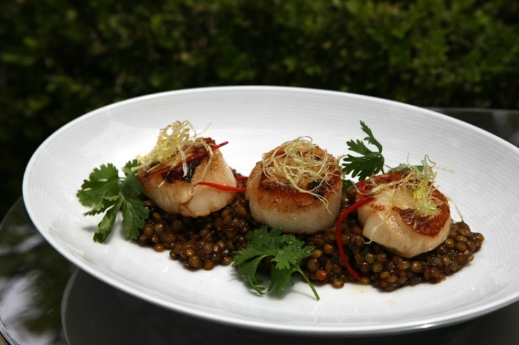 8 طريقة التقديم: تسكب حبّات المحار المقليّة فوق العدس الأخضر في طبق التقديم، ويزيّن بالحرّ الأحمر وأوراق الكزبرة الخضراء.