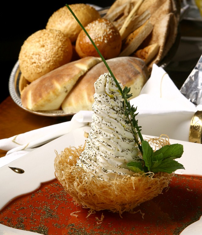 4. نضع سلة الكنافة في طبق التقديم وتوضع اللبنة عليها ثم تزين بالنعناع الأخضر والناشف وبزيت الزيتون.
