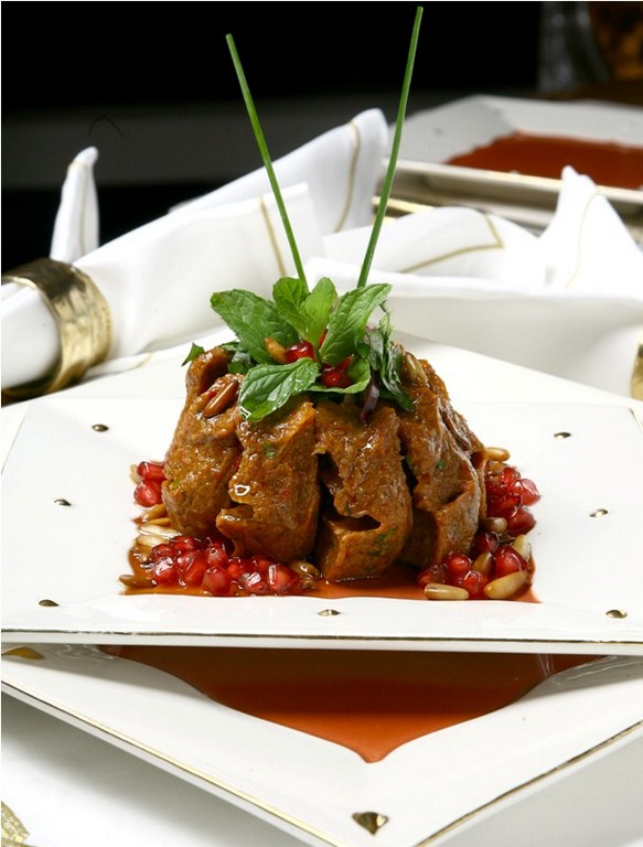 3. وأخيراً نضع البقدونس والبصل في الوسط وتزين بقليل من الصنوبر والنعناع والجوز وحبات الرمان.