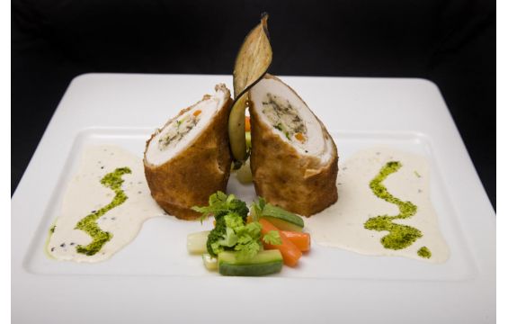 2-يسلق كلّ من الفليفلة والفطر والجزر والكوسى بصورة نصفية. يحشى صدر الدجاج بكفتة الدجاج والخضر المسلوقة وجبنة "البارميزان"، ثم يلفّ كما هو موضّح بالصورة.