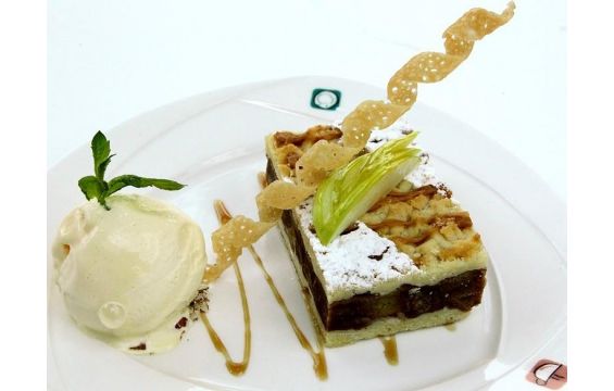 6- يعاد القالب مجدداً إلى الفرن لمدّة 45 دقيقة، ثم يقطّع ويقدّم مع الآيس كريم والتفاح المقطع.