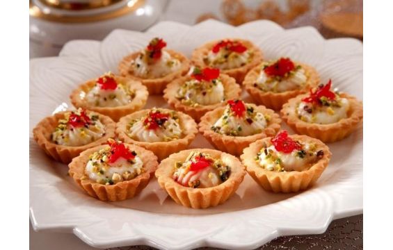 9- ضعي في كل «تارت» بعض القشدة والعسل، ثم زينيها بمربى الزهر والفستق.