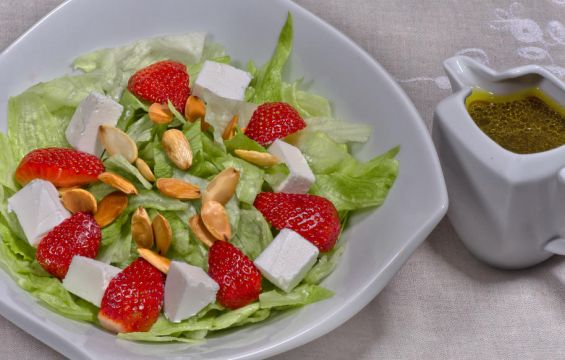1. يقطّع "الآيسبرغ" إلى قطع كبيرة، توزّع في طبق التقديم.ثم، تزيّن بحبات الفراولة، بعد قطع كلّ منها إلى 4 أقسام.ويوزّع الجبن على سطح الطبق، بعد قطعه إلى مربّعات صغيرة.وينثر اللوز المحمّص.
