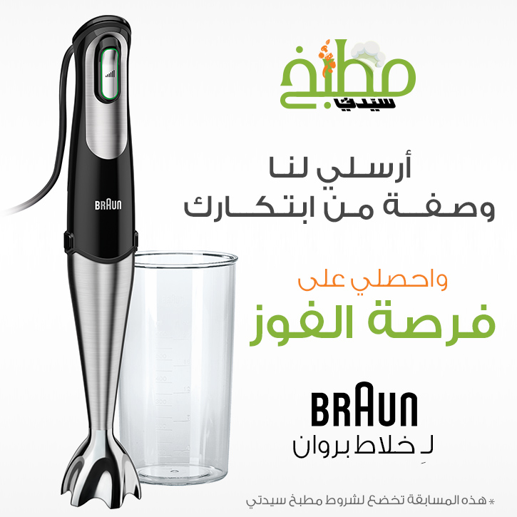 ليس عليك سِوا إدخال بياناتك وإرسال مقادرير الوصفة وطريقة التحضير على "موقع مطبخ سيدتي" لتحصلي على فرصة الفوز بخلاط يدوي من براون.