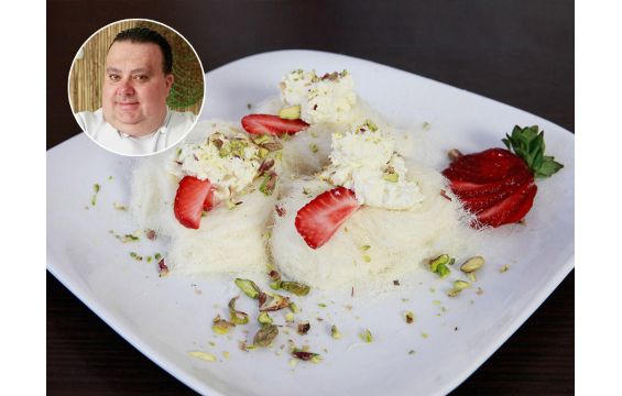 3- زيّني الطبق بشرائح من الفراولة ورشّي عليه الفستق الحلبي المفروم.