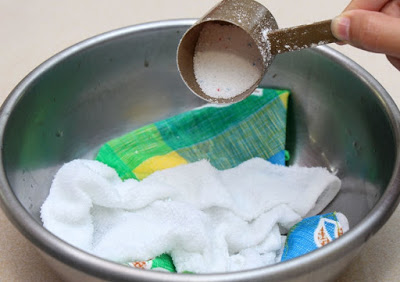 1. انقعي المناشف في وعاء، واغمريها بالماء الساخن، وأضيفي مسحوق تنظيف الملابس الذي تستخدميه للغسيل، واتركي المناشف لمدة طويلة (ليلة كاملة) حتى تذوب الدهون والبقع، ثم قومي بشطف المناشف، واتركيها لتنشف جيداً بالشمس.