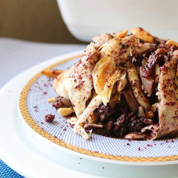 3. في صينيه يفرد الخبز ويمسح بقليل من مرق الدجاج ثم يضاف من البصل بالسماق، وقليل من المكسرات المحمصة (ممكن إضافة رشة من السماق الناشف) ثم يفرد فوقها.
