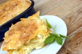 6. ضعي العجين المحشو في طبق الفرن واخبزيه لمدة 20 دقيقة حتى يصبح ذهبياً ومقرمشاً.