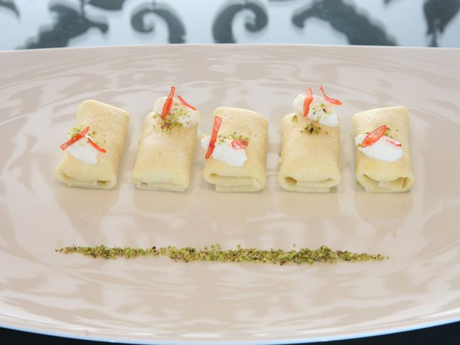 3 ـ  عندما يبرد، يقطّع إلى مربّعات، تُحشى بالقشطة، وتزيّن بالقشطة والفستق وزهر الليمون. يقدّم مع القطر.