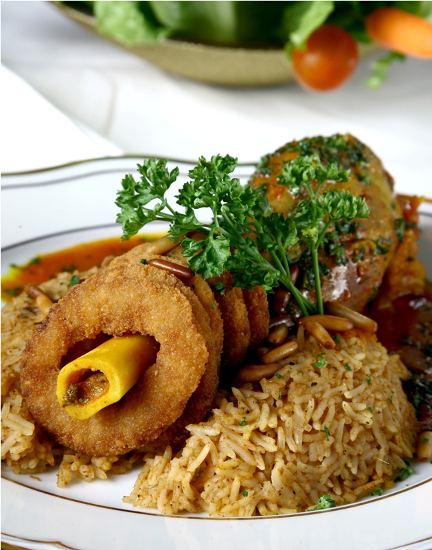 4. يسكب في طبق التقديم ويزين بالكاجو والصنوبر ويزين بورق البقدونس وشرائح البصل المقلي.