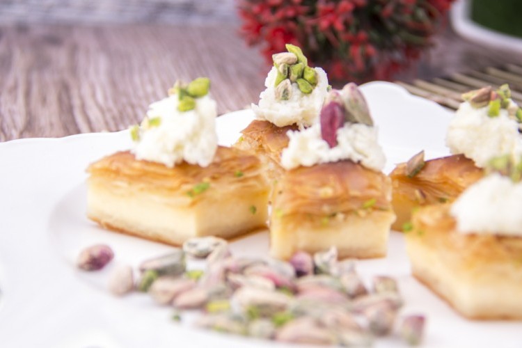 4. اقسمي البسبوسة وخذي نصف الخليط وضعيه في الطبق وافرديه جيداً، ثم ضعي الحشو فوقه ثم وزعي باقي البسبوسة فوق الحشو، حاولي فرده بظهر الملعقة الخشبية أو بواسطة شوكة وافردي أو وزعي خليط البسبوسة بهدوء بحيث تغطي الحشو تماماً، أدخلي الطبق إلى الفرن لمدة ثلث الساعة، حتى يصبح السطح ذهبياً، ثم أخرجيه وصبي فوقه الشيرة، حاولي توزيع الشيرة جيداً في كل الأماكن لتضمني أن يصل إلى الطبقة السفلى، ثم وزعي الفستق الحلبي على سطح البسبوسة.