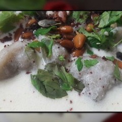 4. لتحضير خليط اللبن: ضعي لبن المخيض (الشنينة) بقدر على النار، وأضيفي كمية النشا، وابدأي بالتحريك، باستخدام المضرب اليدوي، ثم أضيفي مكعب مرق دجاج، وابدأي بوضع حبات العجين المحشوة، واتركيه حتى يتسبك.