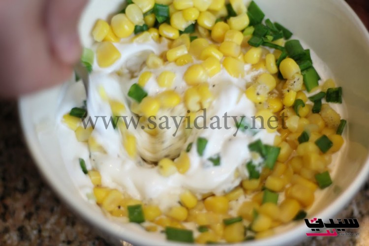نضيف الذرة إلى اللبنة والثوم مع إبقاء القليل للزينة