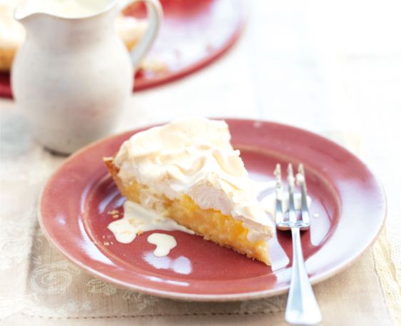 5. وزّعي الحشو على سطح العجين، وضعي "المرنغ" فوقه، باستخدام سكين. واخبزي لمدّة تراوح ما بين 20 و25 دقيقة، وذلك حتى يصبح بنيّ اللون. ودعي هذه الفطيرة تبرد لساعة، قبل تقديمها مع "الآيس كريم" (اختياري).