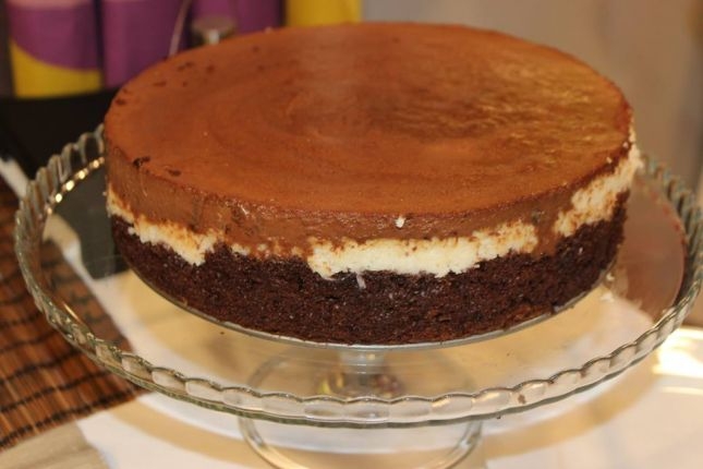 1. لتحضير الطبقة الأولى: نخفق البيض والسكر معا ثم نضيف الزيت والفانيلا ونتابع الخفق لمدة دقيقتين ثم نضيف الطحين والكاكاو تدريجيا بالتبادل مع الحليب السائل.