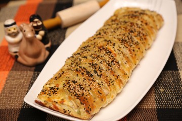 4. وزعي مقدار من الحشو في قطع البف بستيري وأغلقيها على شكل مثل أو مربعات حسب الرغبة.