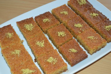 4. تدخل فرن ساخن على درجة حرارة تصل إلى 180 درجة لمدة نصف ساعة كاملة، وتخرج لتسقى بالشربات الساخن على الفور وبالتدريج، مع مراعاة أن يكون الشربات جاهز بعد مرور الربع ساعة الأولى للبسبوسة فى الفرن، حيث يرفع الماء مع السكر على النار العالية وبعد الغليان أضيفي عصير الليمون وعسل الجلوكوز والفانيليا، وتخفض النار للمتوسط وتترك حتى تغلي تماماً لمدة تصل إلى 7 دقائق، وبعد تمام نضج البسبوسة قومي بتزين الوجه بالفستق المجروش الناعم.