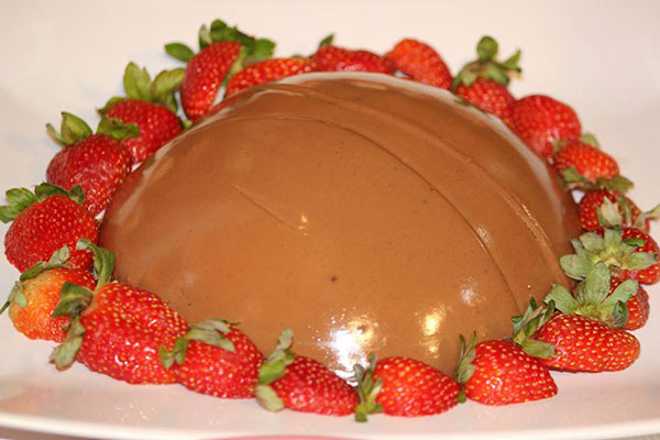 3. نقلب الخليط بطبق التقديم ونزينه بالفراولة أو أي نوع فواكة.